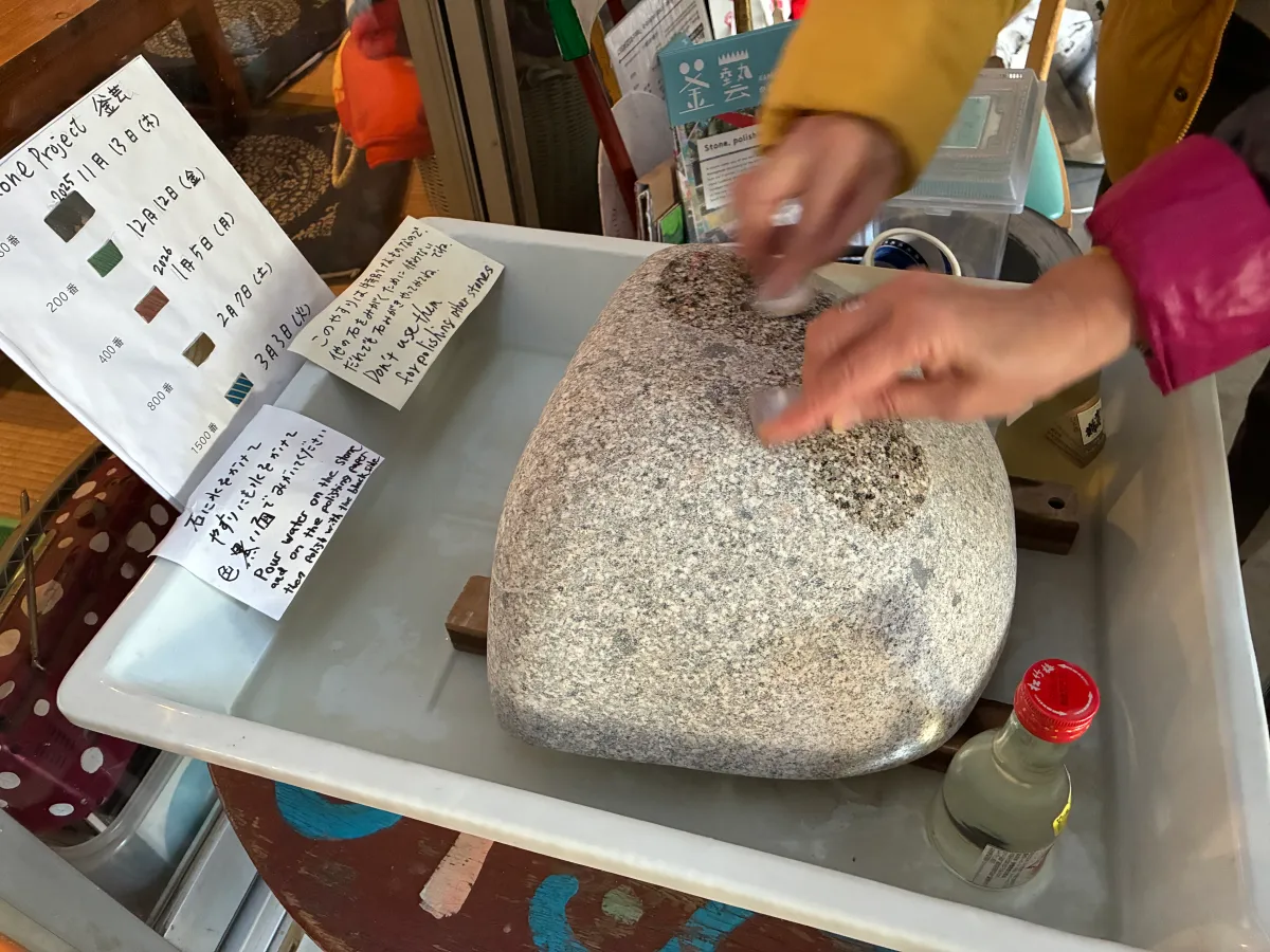 また、この日は「井戸から出てきた大きな石を誰かと磨く」というプロジェクトが行われており、私も参加させてもらいました。石の手触りが徐々にツルツルになっていく感覚は、驚くほど心地よく、無心になれる豊かな時間でした。