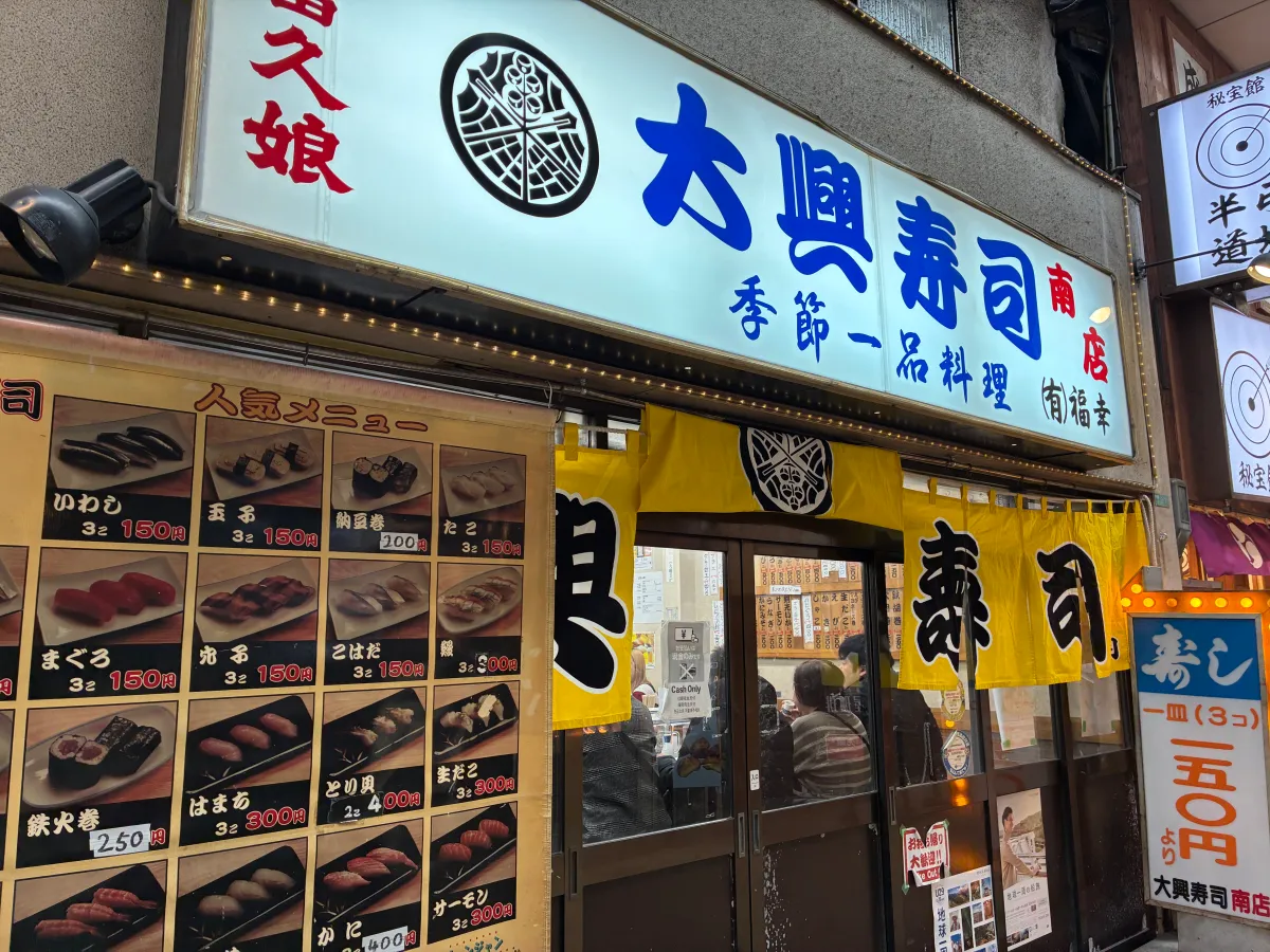 ジャンジャン横丁にある老舗。一皿3貫150円〜でリーズナブル